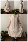 『裾切り替えバルーンと裾フリルが前と後ろで表情を変える前開き手織り綿ワンピース』