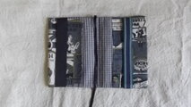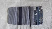 裏地は黒ギンガムチェックで、本の厚さを調節できるように内側に折り込む形で、折り込み部分を挟むテープは黒のグログランテープを使っています。