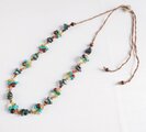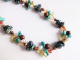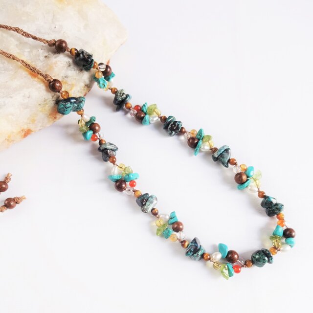 使用パーツ:クリソコーラ ターコイズ(染) ペリドット カーネリアン シトリン 水晶 淡水パール ウッドビーズ 小安貝 ドイツ製シルクコード(ベージュ) ブラジル製ワックスコード