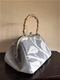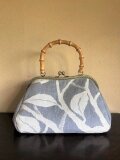 爽やかな水色の紬に、白で大胆な枝葉模様を織り込んだ名古屋帯を、竹の手がま口手提げにしました。よくよく見ると白の枝葉の縁を刺繍してあるようで、奥行きが感じられます。
