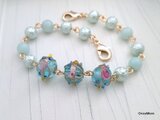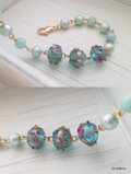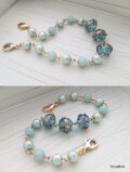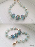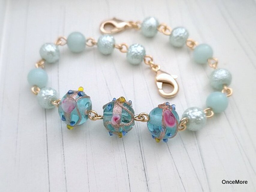 ブルー地のガラスの表面にゴールドの帯、不規則な装飾(突起)をつけたデザインが特徴のインドビーズをメインにしました。