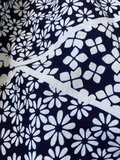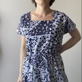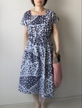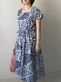 白に紺の花柄の浴衣地で、スクエアネック&ティアードスカートのワンピースを作りました。