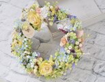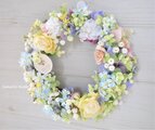 全体に とてもやわらかく おだやかで 愛らしい印象の花の輪に仕上がりました