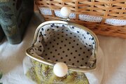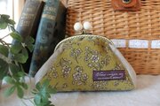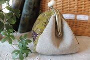マスタードのコーデュロイとベージュのリネンで、がまぐちポーチを作りました。^^