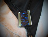 ●きらめくミラー素材と、深い海の色に染めた螺鈿(らでん)を張りあわせ研磨し、ループタイをお作りいたしました。