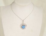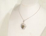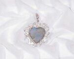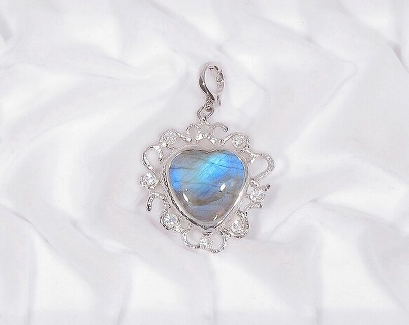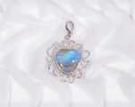 ブルーの発色が綺麗なラブラドライトと、輝きの綺麗な再生ダイヤモンドのトップです。チェーンを通す金具(クリッカー)は開閉出来るので、チェーンの他にパールネックレスなどにも付けられます。