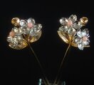 上にくる花が右のものと左のもの、2パターン作りました。花芯の中心には染め珊瑚をあしらいました。