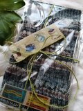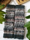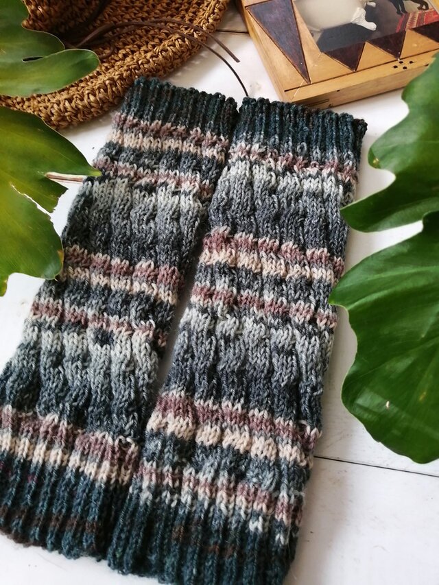 落ち着いたアースカラーを墨色でふちどりした、手編みのレッグウォーマーです。