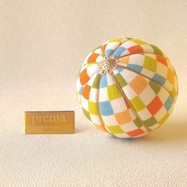 コットン100%の生地を木目込みました。それだけで充分すぎるほど美しいハーモニー。装飾をなるたけ省いた、シンプルな真理(まり)です。