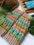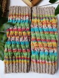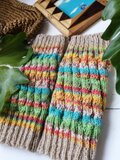 熱帯雨林のインコの鮮やかな羽根のような色あいの、手編みの短いスパイラル編みレッグウォーマーです。