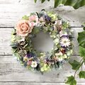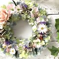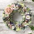 周りにシルバー二ゲラやドライフラワーの帝王貝細工やハナカンザシ、アーティフィシャルフラワーも入れた多彩なリースです。