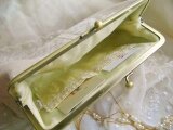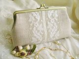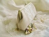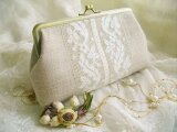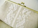 エクリュ(淡いベージュ)リネンにアンティークレースをのせたがま口ポーチ