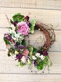 大輪のラナンキュラスをメインに、ワイヤープランツのオシャレなフォルムで動きを出したナチュラルリースです。
