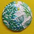 サーモンピンクの地に黒い花の刺繍、ありそうでなかったこの色のとりあわせ、すてきなブローチでした。