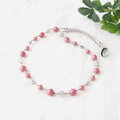 カットがキラリと輝く落ち着きのあるピンク色のシリシャスシストに透明感を感じられるグレームーンストーンを合わせ、ライトグレー色のポリエステルコードで繋いだ上品な雰囲気のネックレスです。