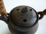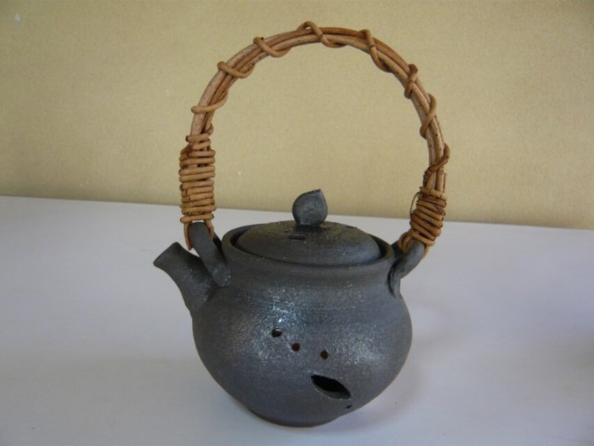 蓋の下の皿にお茶を入れて水で少し湿らせます。ロウソクはティーキャンドルです。ロウソクで温めますとお茶のいい香りがしてきます。お茶屋さんの店先でお茶を焙じている香りをおもいだします。炭化焼成です。ひとつひとつ表情が違い1点ものです。蔓はアケビです。