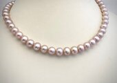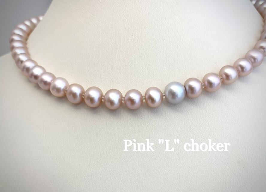 ポエジのロングセラーのピンクチョーカーですが、今回はワンサイズ大きい”L”の7.5~8.3㎜というボリューミーなチョーカーに組み上げました。