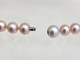 そして、留め具に注目!オリジナルのPPSシステム採用。8mmのナチュラルグレー色のパールをメス加工し、クラスプの受けに使いました。オス加工したピンクパールの端を差し込んで使います。外すときは、オスとメスのパールの間に指先をねじ込む感じで入れてください。簡単に外せます。PPSの操作の仕方はYouTubeの動画を参照くださいね。URLは https://youtu.be/uRaFyFVrJP4