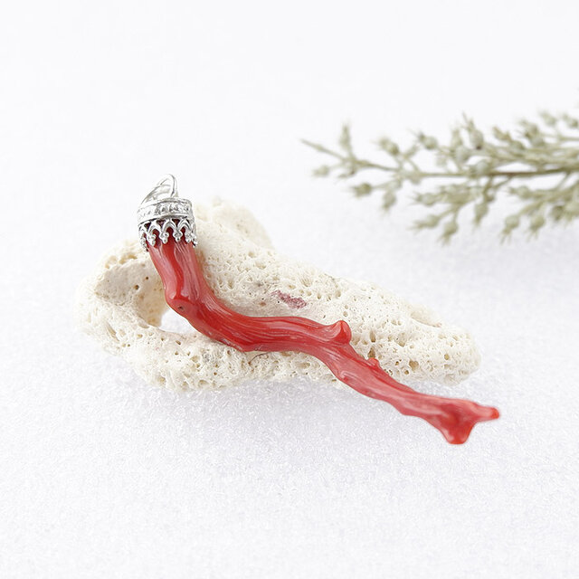 真っ赤な枝珊瑚にシルバーの金具を取り付けたシンプルなペンダントに仕上げました。
