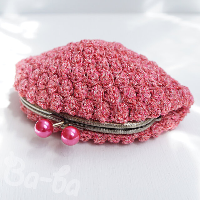 ラメ混紡糸の「パプコーン編み」編み地をがま口に仕上げました。