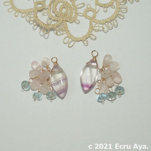 イメージはパープルフローライトから、ローズクォーツとアクアマリンのたわわがこぼれ落ちる感じです。
