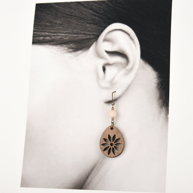 小さな花咲くエッグシェイプのウォールナットエレメントに、涼やかな白色が美しい艶消しリバーストーンを添えた木製ピアス。