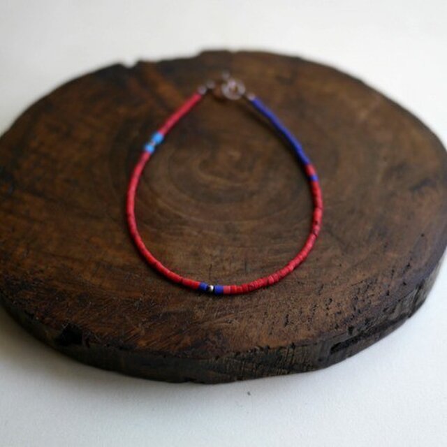 アフガニスタン産の高品質のコーラル(珊瑚)とラピスラズリ, ターコイズを一旦粉末状にして、ビーズに再加工した手間と時間を掛けた大変希少なブレスレットです。