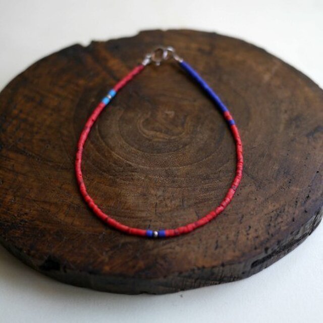 アフガニスタン産の高品質のコーラル(珊瑚)とラピスラズリ, ターコイズを一旦粉末状にして、ビーズに再加工した手間と時間を掛けた大変希少なブレスレットです。