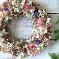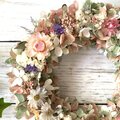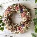 ドライフラワーの帝王貝細工やスターチス・ユーカリなどを淡いピンクのカラーに仕上げたリースです。