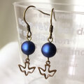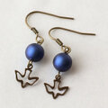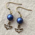 マットカラーのようなメタリックブルーのクリスタライズ・スワロフスキーのパールと鳥のパーツをつなげました。