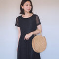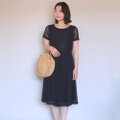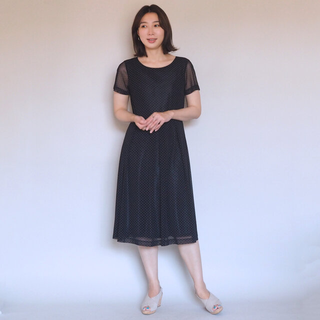・生地アップ写真を見ると分かる通り、ネットのようなメッシュ生地です。身頃とスカートに裏地を付けているので、透ける心配もなく、涼し気・軽やかな抜け感を楽しめます。袖の部分には裏地なしで、通気性もよく夏におすすめの素材です。