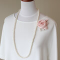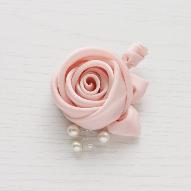 サテンの光沢が美しいバラのコサージュです。少し紗がかかったような風合いのサテン生地を使用しています。バラの実(ローズヒップ)を模したパールをあしらいました。やわらかいフォルムにやさしいコーラルピンクのコサージュはフォーマルにもちょっとしたお出かけにも活躍します。