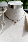 2.5mm程度のボタンカット型のサファイアをソフトタイプのワイヤーに通して作ったネックレスの中央部分には、ゴールドとシルバーのビーズを並べてアクセントにしています。ウォーターメロントルマリンが細いゴールドの枠で囲まれていますので、ゴールドのビーズを入れることでネックレスとトップのお色目の統一感を出しています。