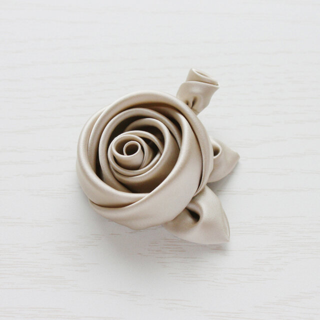 シルクの光沢が美しいバラのコサージュです。光をなめらかに反射する上質な国産のシルクサテンを使用しています。グレージュはいろいろな服に合わせやすい色合いです。やわらかいフォルムのシルクコサージュは、パーティーや入学式、卒業式などのフォーマルな場面で活躍します。