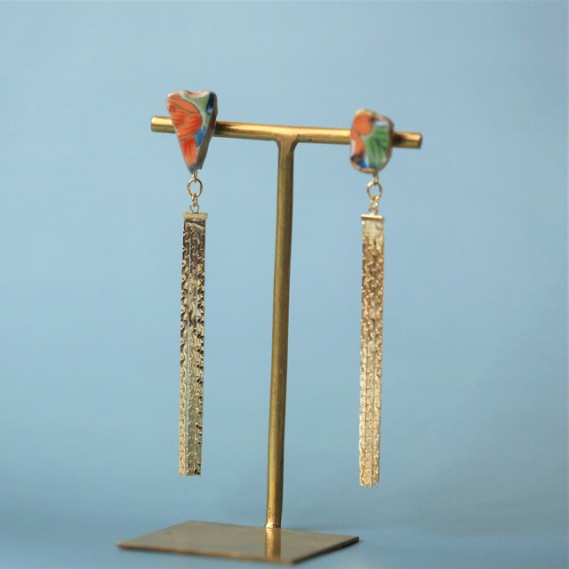 有田焼 陶片 x 金継ぎ ピアス イヤリング (花柄陶片、ゴールドスウィングパーツ)