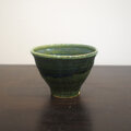 全体に織部釉(緑釉)を施釉しています。ロクロ成型時についた轆轤目の跡に釉が溜り、濃淡が景色となっています。井戸型に近く深さが特徴です。