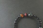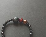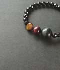 ブルータイガーアイ、レッドタイガーアイ、そしてイエロータイガーアイを小粒のブラックオニキスで紡いだブレスレット。