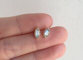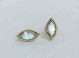 スッキリとしたマーキス型のレインボームーンストーンを、シンプルに2本の爪で留めてさりげなく輝きを魅せる一粒石ピアスにお仕立てしました。