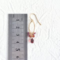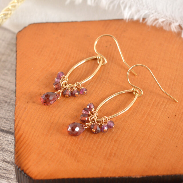 深みのある赤が特徴的なガーネット。14KGF縦長フープに、しずく型ガーネットと小粒ガーネットを付けて揺れる大人ピアスにしました。