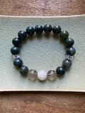 深い緑色のモスアゲートに、グリーンルチルクォーツやブルームーンストーン、水晶が寄り添うブレスレット。