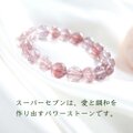 スーパーセブンは、アメジスト、スモーキークォーツ、ルチルクォーツ、ゲーサイト、レピドクロサイト、カコクセナイト、クリアクォーツの7種類の石の性質を持ち合わせている石で、地球と地球上に存在するすべての生命の波動を上げ、平和と安心感、連帯感を与えてくれる、愛と調和の石と言われています。
