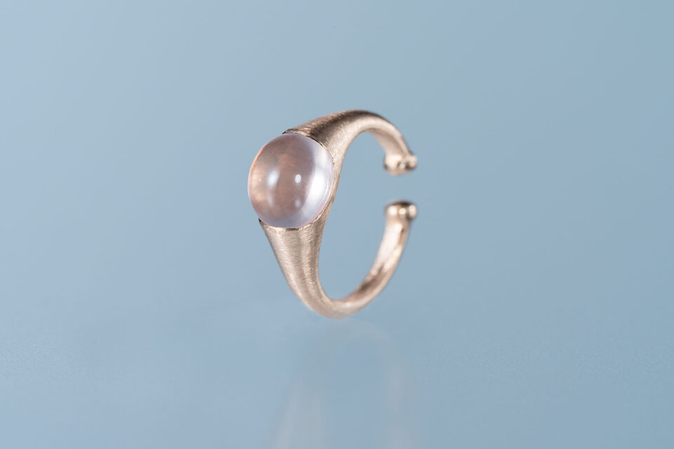 K18PGのマット仕上げが、ローズクオーツの柔らかな雰囲気にぴったりです。 裏側から光をあてるとスターが見られます。