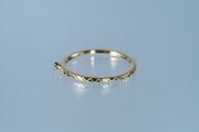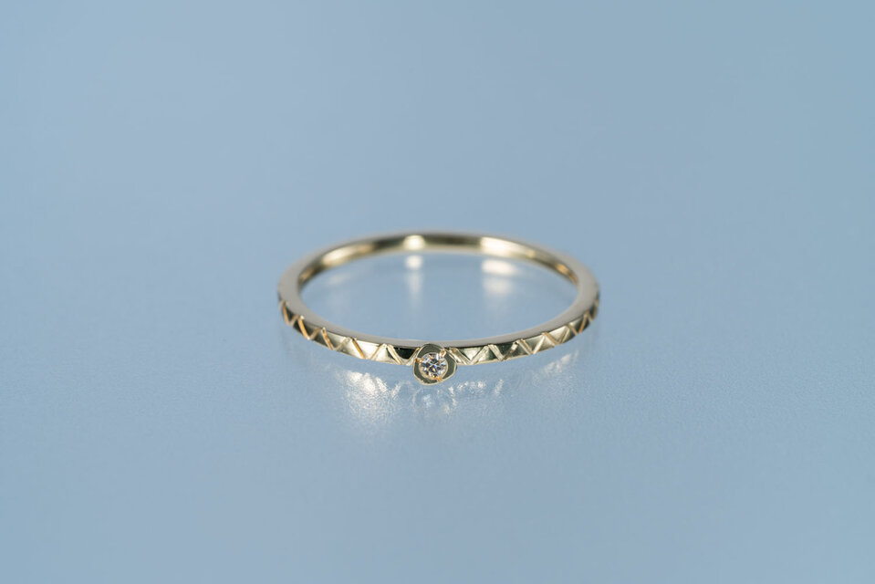 マット加工したゴールドのリングにシングルカットダイヤモンドを留めたリングです。