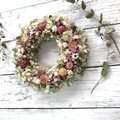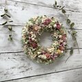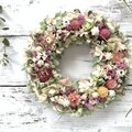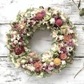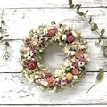 本当に淡いピンクの帝王貝細工やコロンとした千日紅が可愛らしいドライフラワーをたっぷり使ったくすみカラーのリースです。