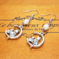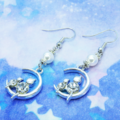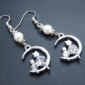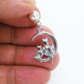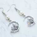 三日月に乗る親子が寄り添う猫モチーフのピアス シルバーカラー スワロフスキーパール ラインストーン
