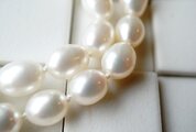 艶やかで美しいライス型のホワイトパールを1粒ずつシルク糸で結びながら作ったネックレスです。思い切ってショートネックレス2連分のパールを使って長いネックレスに仕立てました!! パールは大きさに少しばらつきがあり、8mm~10mm程度とお考えくださいませ。その分お値段少しお安くさせていただいております。
