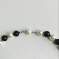 こちらはガラス素材の原玉に、オリジナルパール塗料にて何層にも渡り重ね塗りを施した日本製ガラスパールネックレスになります。パールの間1つ1つに結び目を入れたオールノット加工を施しております。パールサイズはスタンダードな直径約8mm玉で、長さは標準的なプリンセスサイズの全長約42cm。パールカラーはホワイトパールとブラックパールをコンビにしたモノトーンデザインに。