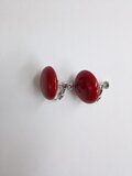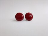 樹脂製の直径約20mmの大ぶりで淵が丸みを帯びたボタンタイプカボションに、オリジナル塗料で何層にも渡り重ね塗りを施した深みのある濃い赤珠ビーズイヤリングになります。天然石等とはまた違った趣のある色味になっています。イヤリング金具にはネジバネタイプを使用。付け外しもしやすくネジ部分での微調整も可能です。