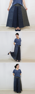手織り綿絣のパッチワークワイドパンツ、インディゴミックス、オールシーズン