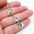 チェーンには小さなハートとロザリオをプラスして、繊細さとともに華やかさを演出しています